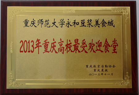 近日,为了激励重庆高校学生食堂的积极性和创造性,大力推进学生食堂工作健康稳定持续发展,重庆晨报与重庆教育后勤协会联合推出“2013年重庆高校最受欢迎食堂”评选活动,我校大学城校区“永和豆浆美食城”获此殊荣。据悉,此次活动共在全市各类高校中评选出重庆大学、西南大学、西南政法大学、重庆师范大学、重庆交通大学、重庆邮电大学、重庆理工大学、重庆科技学院、重庆工商职业学院和重庆工业职业技术学院等高校的14个最受欢迎食堂并授牌。
