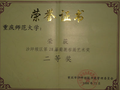 2008年12月,我校参加了沙坪坝区第28届菊展。在后勤服务集团物业管理中心员工的共同努力下,精心准备了千盆菊花,色彩搭配合理,艺术气息浓郁,喜获沙坪坝区第28届菊展布展艺术奖二等奖。