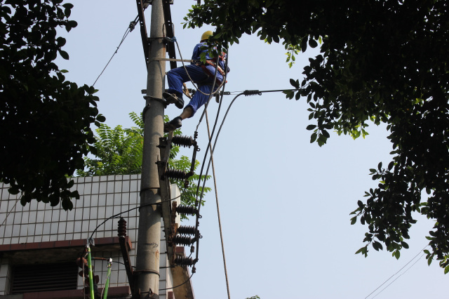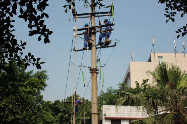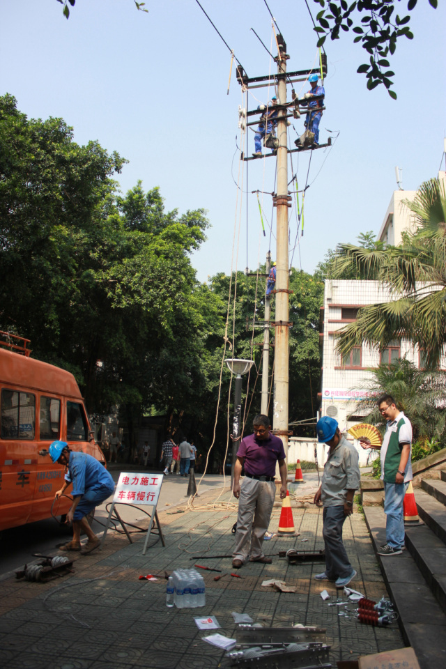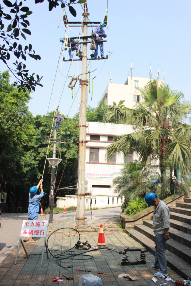 上午,集团能源设备部工作人员早早地来到了现场,经过紧张细致的准备,对现场进行了最后的检测。在集团领导张万春总经理亲自指挥协调下,相关人员顶着烈日作业,通力合作,对一食堂门口的南师线高压开关、高压避雷系统进行了抢修工作,消除了沙坪坝校区的电力隐患,极大地降低了校内发生电网故障的可能。整个工作一直持续到中午12点才正式完成。为了确认修复的可靠性,集团参与作业的职工又不辞辛苦地对排险完毕的高压电线进行了反复检测,确保未发现异常后,才向学校申请恢复供电,下午13:00点左右沙坪坝校区恢复了供电,比原计划提前了两小时,办公和教学也秩序井然。