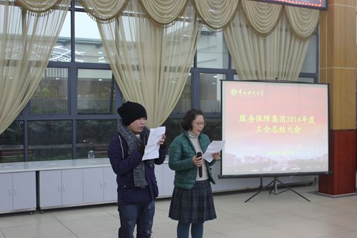 大会分为两个阶段。第一阶段中,胡缨纬首先作了2014年度工会工作总结,张万春总经理代表集团班子向全体工会会员作了年度工作汇报。接着,孔春阳副校长讲话,他充分肯定了后勤集团在2014年度取得的成绩,感谢集团全体职工和离退休老同志为学校发展付出的辛勤努力,并为大家送上了新年祝福。陈兰主席也在会上欣然发言,为集团工会工作点赞加油。